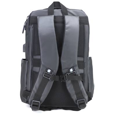 Mochila para notebook personalizada confeccionada em material sintético com compartimento para notebook até 15,6 polegadas. Contém um compartimento grande com divisórias para documentos, eletrônicos, polegadas e tablet. Dois compartimentos frontais, sendo um com divisórias para documentos, eletrônicos e caneta. Um bolso traseiro oculto. Tecido Impermeável dois bolsos laterais e adaptador USB externo com cabo acoplado, permitindo a conexão de um carregador portátil de dentro da mochila e transferência da carga para o lado externo, ocultando o carregador e viabilizando a utilização do celular durante o processo. Contém zíperes com pegadores plásticos, alça de mão em nylon, alça horizontal para encaixe em malas de viagem e alças para as costas ajustáveis com revestimento espumado antitranspirante. Imagem ilustrativa.