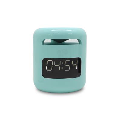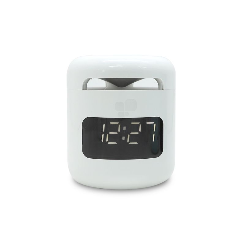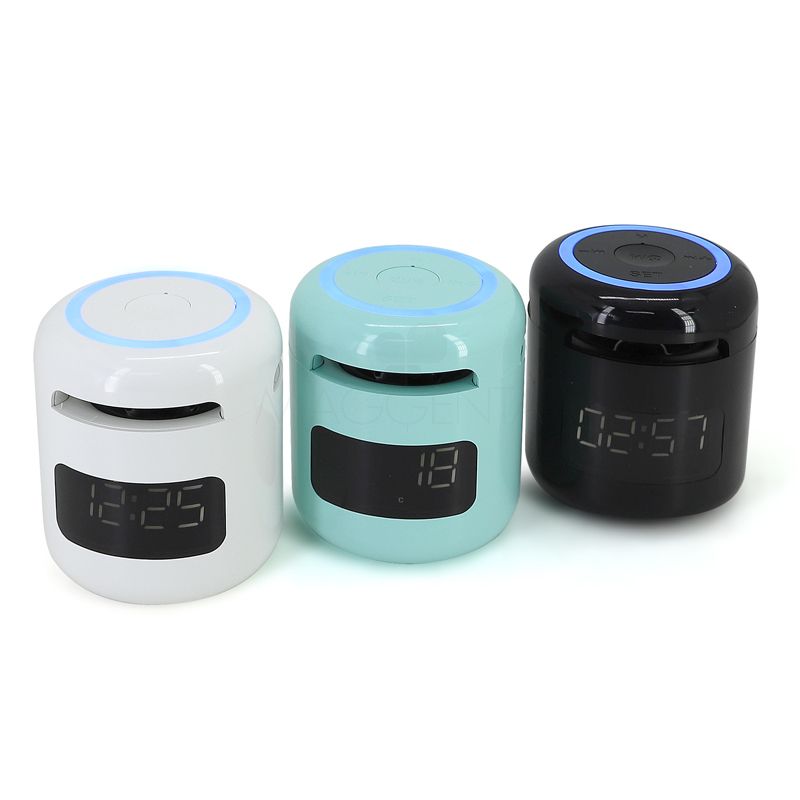 Caixa de som bluetooth com relógio despertador, produzida em plástico e com borrachas antiderrapantes na área inferior, a caixa de som tem bateria de longa duração, display de LED na área frontal, e anel de led brilhante na parte superior. A caixa de som executa nos modos bluetooth, rádio FM, cartão TF-microSD e entrada auxiliar P2. Acompanha cabo USB e manual em inglês e chinês. Imagem ilustrativa.