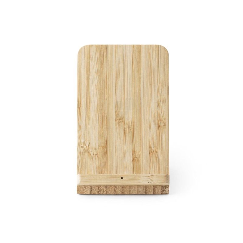 Carregador wireless de bobina dupla em bambu com suporte para esferográficas. Potência de carregamento rápida de 10W e com entradas 5V/2A e 9V/1.67A. Incluso cabo de carregamento USB tipo C de 1m. Todos os dispositivos devem possuir a tecnologia padrão Qi para carregamento. Ideal para brindes promocionais e eventos corporativos. Imagem ilustrativa.