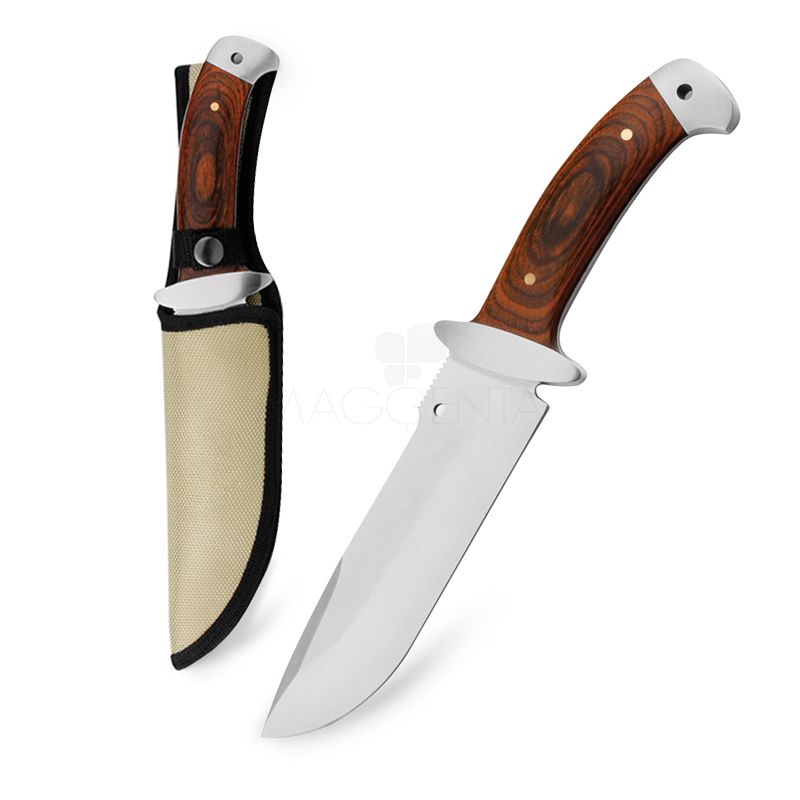 Faca de metal personalizada produzido em aço inox com detalhes em madeira. Possui bolsa em nylon 600D com trava de segurança para facilitar o transporte, empunhadura anatômica, parte superior da lâmina com alguns sulcos que além de darem um detalhe especial à peça também podem ser utilizados como escamador. e lâmina em aço 440. Ideal para pesca, camping e esportes de aventura.