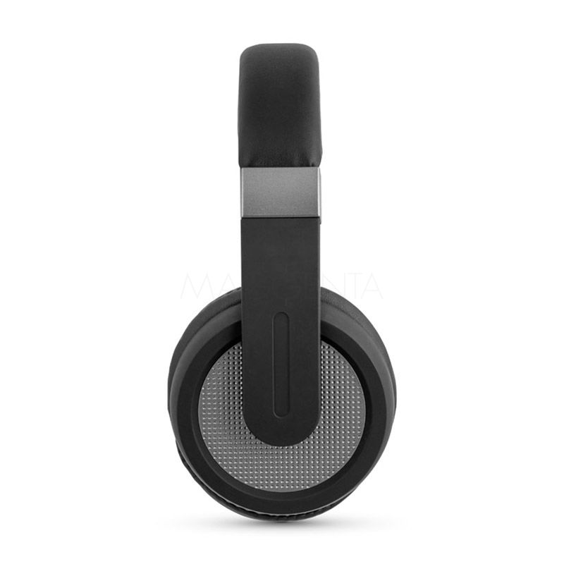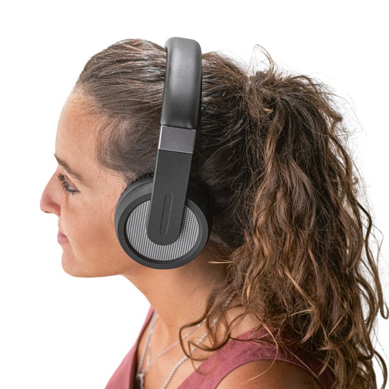 Fones de ouvido em ABS e PU com microfone, transmissão por bluetooth 5.0 e potência de 30 mW. A bateria tem uma capacidade de 300 mAh e tempo de reprodução de 12 horas. Incluso cabo de carregamento micro USB. Imagem ilustrativa.