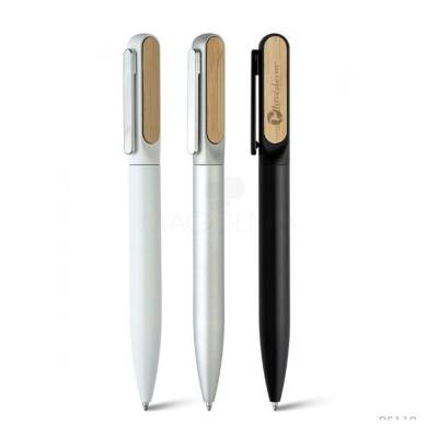 Caneta de metal personalizada com acabamento diferenciado, possui clip de metal, acabamento com detalhe em bambu e esferográfica azul com acionamento por giro. Ideal para brindes promocionais e eventos corporativos. Imagem ilustrativa.