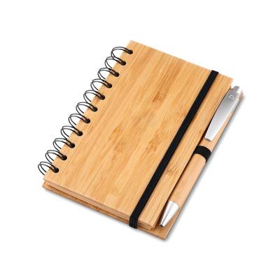 Bloco de anotações personalizado produzido em bambu com capa dura. Possui elástico para fechamento, wire-o de metal, caneta esferográfica em bambu com acionamento por clik e 60 folhas pautadas de papel reciclado. Ideal para divulgar sua empresa em eventos corporativos, brindes personalizados e campanhas promocionais.