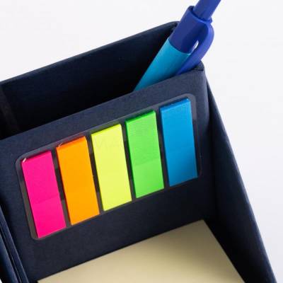 Bloco de anotações no formato cubo articulado, possui compartimento para canetas, 4500 folhas para anotações em 5 cores, 100 auto colantes coloridos em 5 cores e 50 folhas amarelas auto colantes para recados. Ideal para brindes promocionais e eventos corporativos.Gravação silk 1 cor.*Caneta não inclusa ao produto.