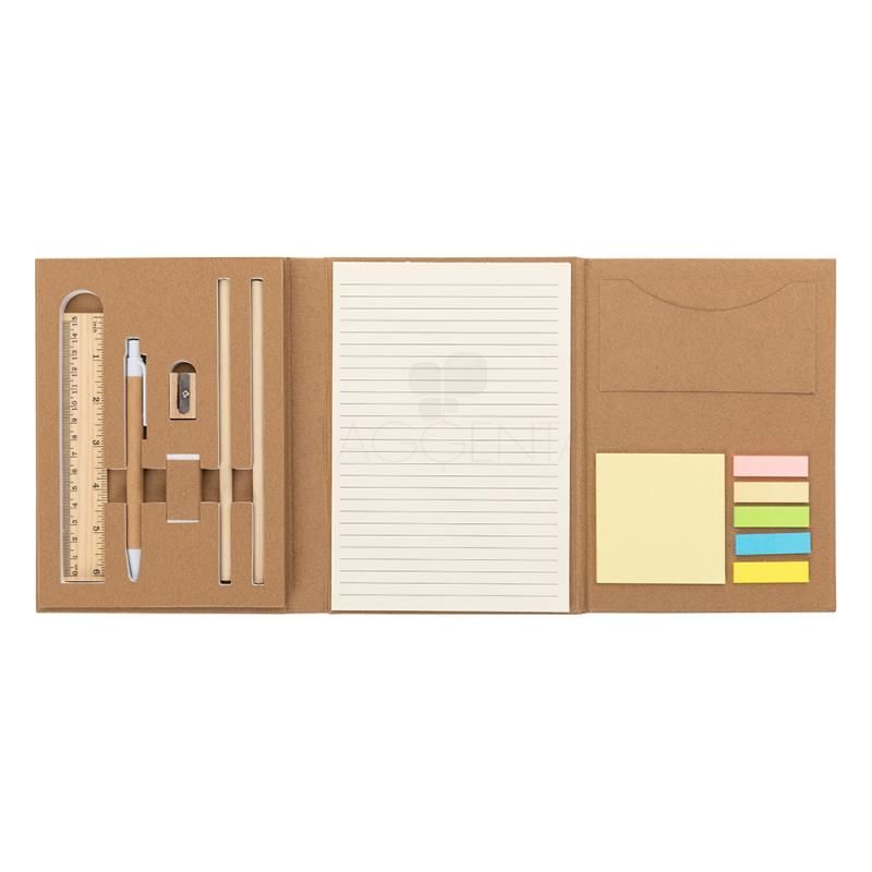 Bloco de anotaçoes personalziado produzido em papel kraft, possui 1 bloco de anotações com 40 folhas pautadas bege; 5 sticky notes colorido com 25 folhas cada, 1 bloco de anotações adesivo 7,5cm x 7,5cm amarelo com 25 folhas, 1Porta Cartão,1 Régua de 15cm de bambu, 1 Apontador para lápis de bambu, 1 borracha, 1 Caneta de papelão com detalhes em plástico, 2 Lápis de bambu e 1 compartimento para cartão. Imagem Ilustrativa.