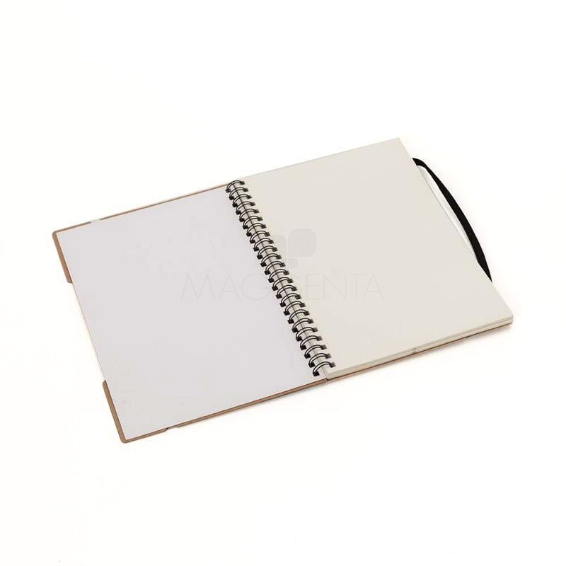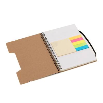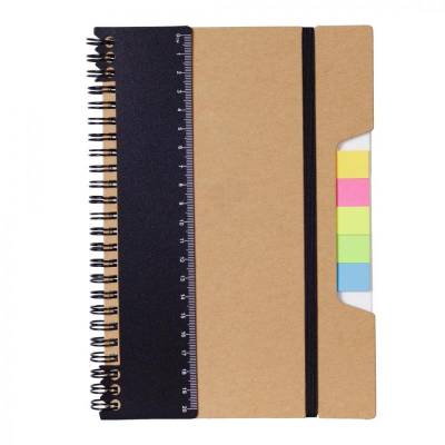 Bloco de anotações personalizado produzido com capa em papel kraft. Possui régua destacável de 20cm, Miolo de 70 folhas pautadas bege, 5 Sticky notes coloridos de 25 folhas,1 Bloco de anotações 7,5cm x 7,5cm com 25 folhas, elástico de fechamento e wireo de metal. Imagens ilustrativas.