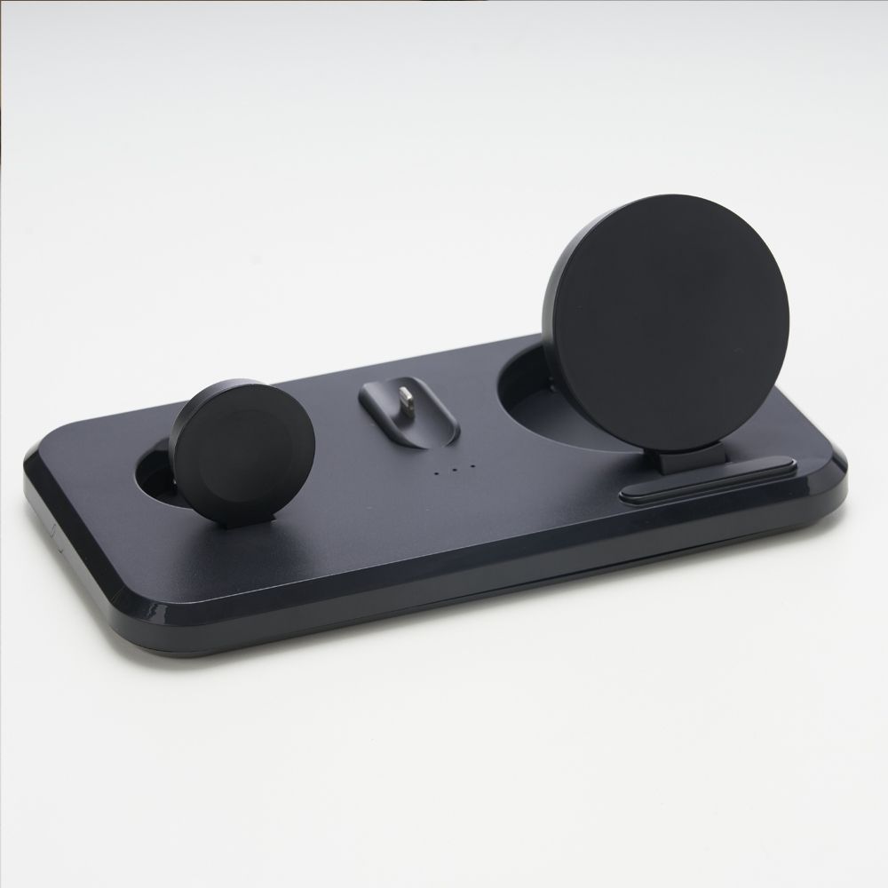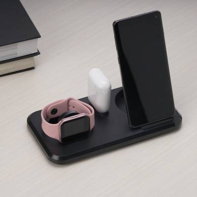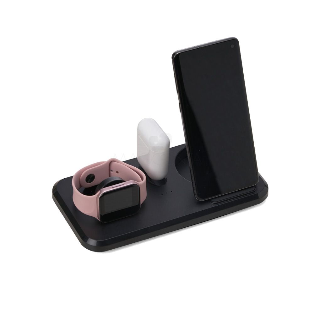 Carregador wireless personalizado com carregamento 3 em 1 para celular, iwatch e fones com entrada Lightning. Com sistema de carga por indução rápida, a estação permite o carregamento sem fio de celulares e iwatchs habilitados com estas tecnologias, além destes suportes, a estação conta ainda com um carregador para fones através do conector Lightning. Sua base contém tapetes de silicone antiderrapantes. Acompanha cabo USB tipo-C. Interface do produto: Tipo-C, Parâmetros de entrada: 5V / 2A 9V / 2A 12V / 2A (MAX), Parâmetros de saída: 5W / 7,5W / 10W / 15W Vigilância de saída: 3W, Fone de ouvido de saída: 2W, Comprimento da linha: 1 metro, Qualidade do material: material composto ABS. Ideal para brindes promocionais e eventos corporativos. Imagem ilustrativa.