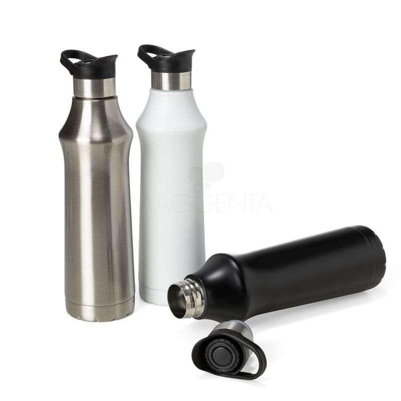 Garrafa térmica 500ml em inox personalizada. Possui tampa plástica com alça para transporte e botão de acionamento (basta um clique para abrir ou fechar). Ideal para brindes promocionais e eventos corporativos. Imagem ilustrativa.