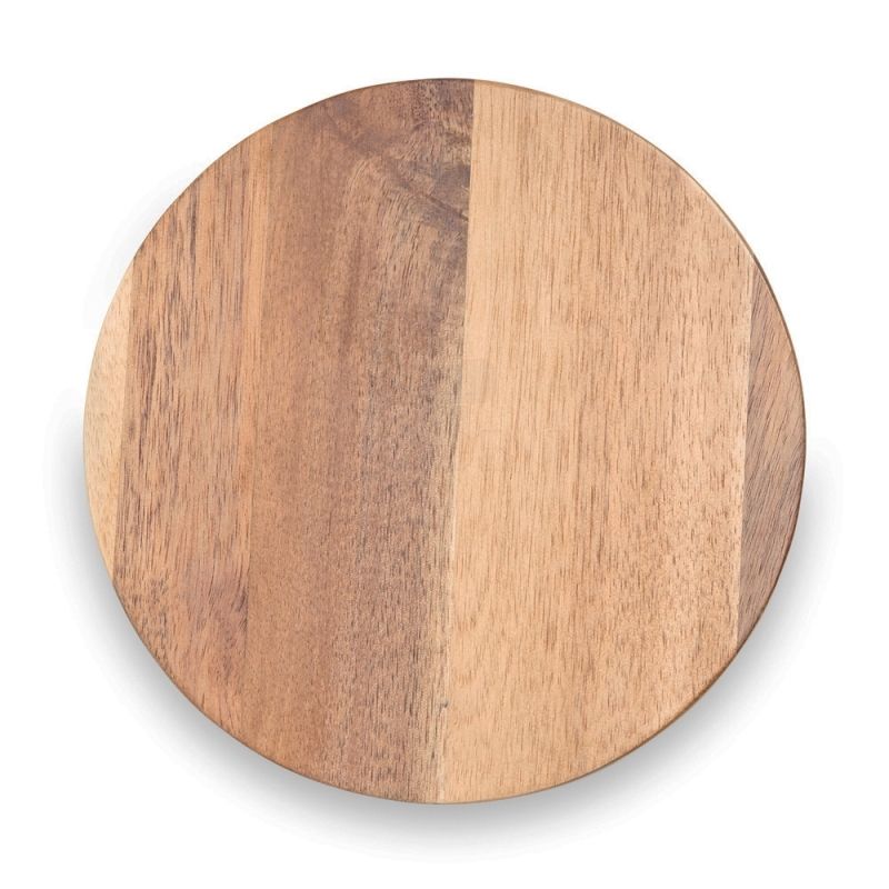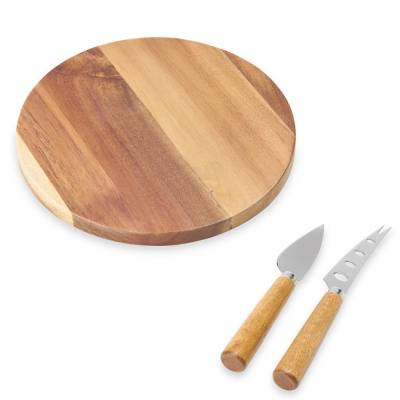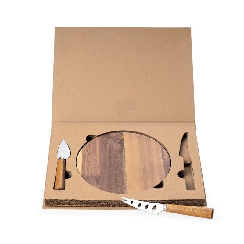 Kit queijo 3 peças em estojo kraft, contém: tábua de madeira redonda, faca com ponta, e faca vazada com ponta. Tábua com orifício para encaixe. Ideal para brindes promocionais e eventos corporativos. Imagem ilustrativa.