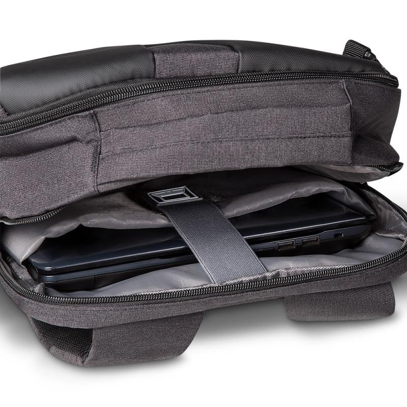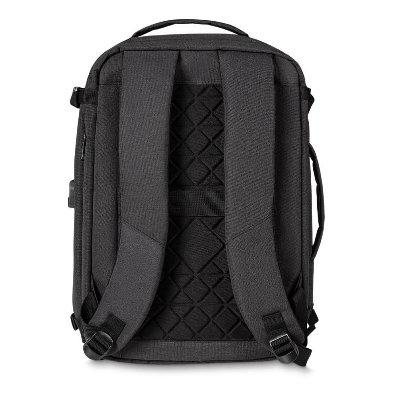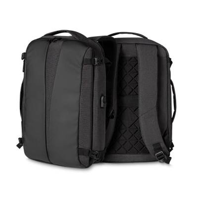 Mochila e Pasta para notebook produzida em tecido poliéster. Possui, parte externa: Conector USB na lateral; Alça de mão e ombro acolchoadas; Bolso para guardar a alça de ombro; Engate para mala de viagem e compartimento para notebook de até 17 polegadas. Ideal para brindes promocionais e eventos corporativos. Imagem ilustrativa. Obs: Compatível com tamanho de notebook máximo de 40 x 28 Cm.