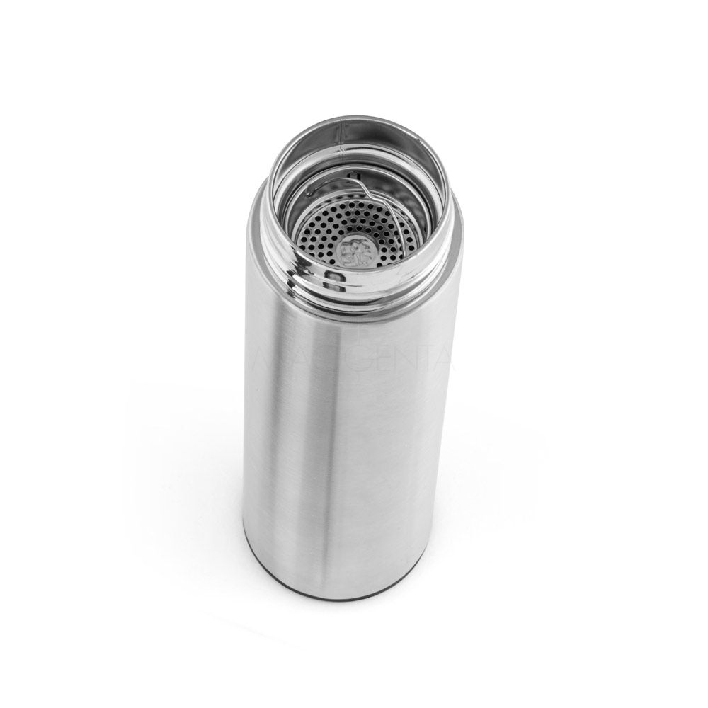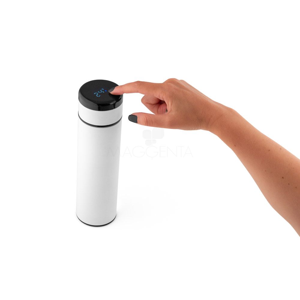Garrafa térmica personalizada com capacidade para 450ml. Possui parede dupla em aço inox, tampa com visor em LED e termômetro digital que permite com um simples toque saber a temperatura do líquido no interior do garrafa. Incluso na tampa um sistema de fácil acesso à bateria para substituir quando necessário. Ideal para brindes promocionais e eventos corporativos. Imagem ilustrativa.