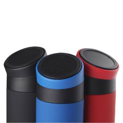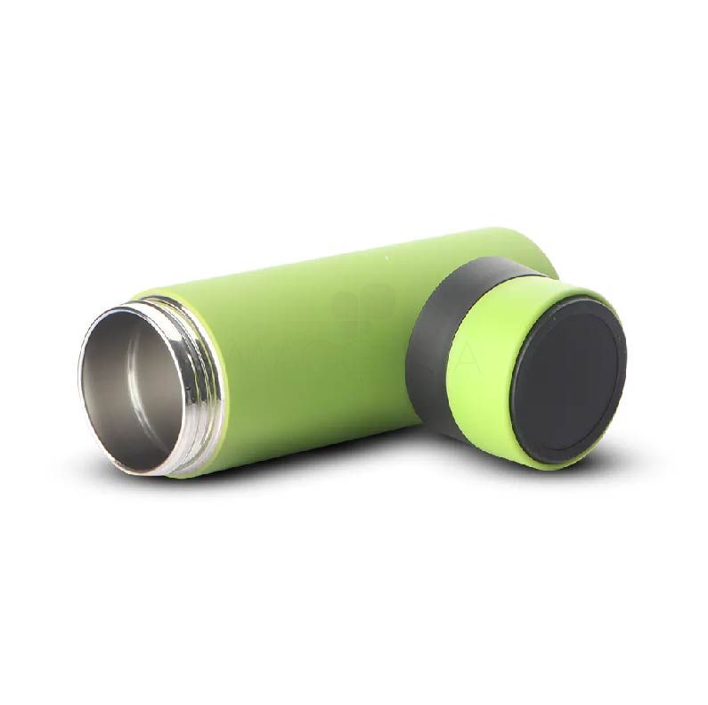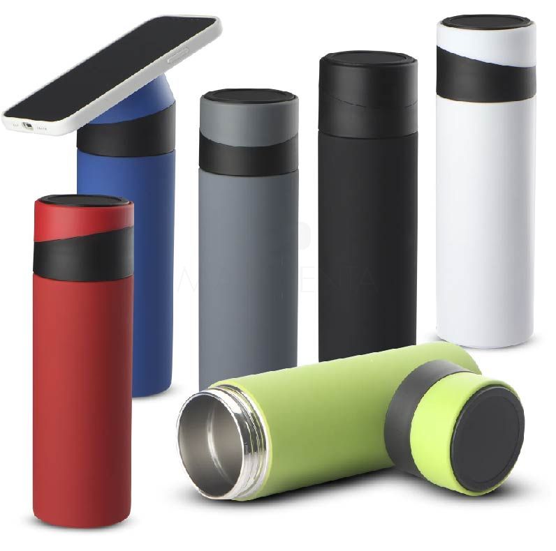 Garrafa térmica em aço inox com parede dupla isolada a vácuo, com capacidade de até 400 ml. Tampa rosqueável com anel de silicone para vedação. Conserva a temperatura quente ou frio. Com apoio para celular na tampa. Conserva a temperatura quente por 5 horas e a temperatura fria por 8 horas.