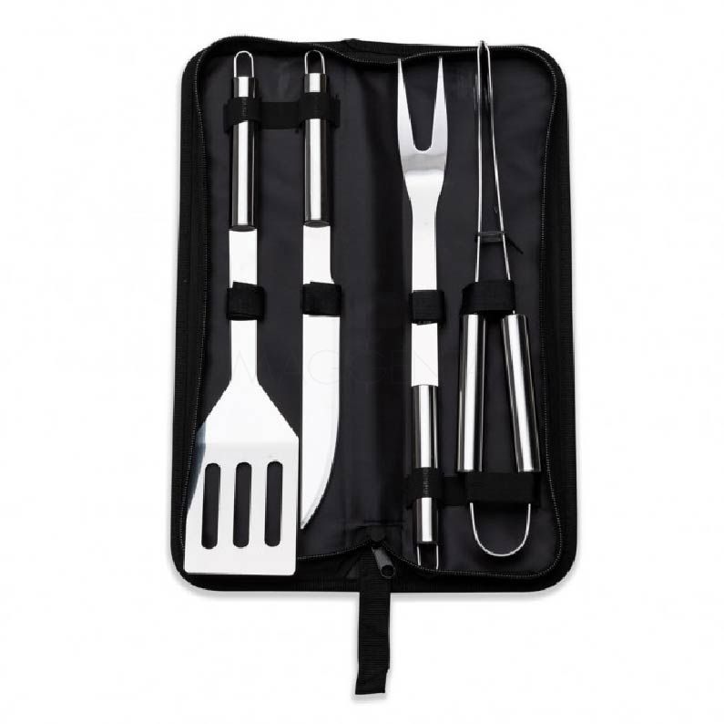 Kit churrasco 4 peças em estojo de nylon com alça. Possui: pegador, garfo, espátula e faca em inox, acompanha proteções plásticas e parte interna com velcro para guardar as peças.