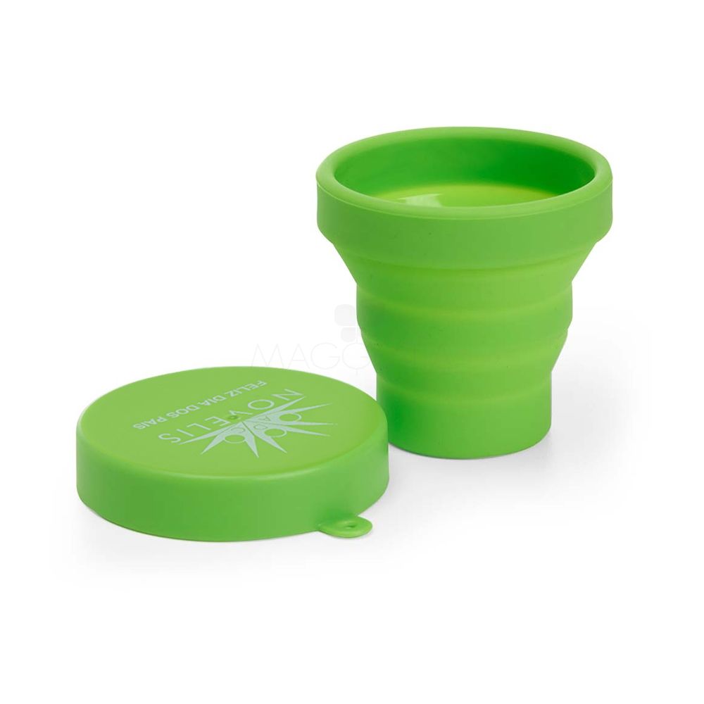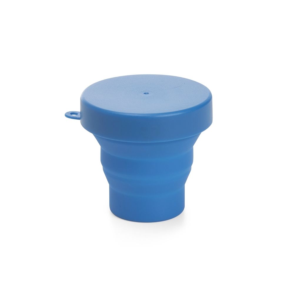 Copo retrátil com capacidade de 150ml, livre de BPA. Contém tampa plástica de encaixe com acesso para chaveiro.
