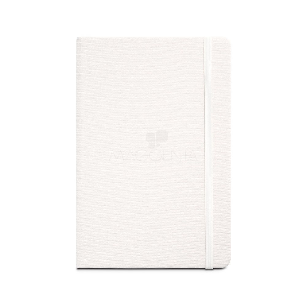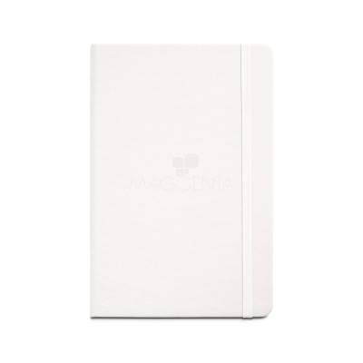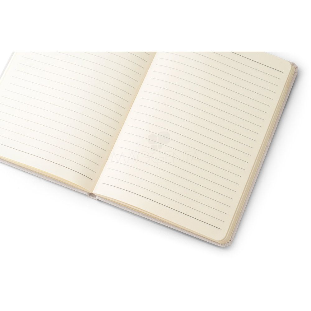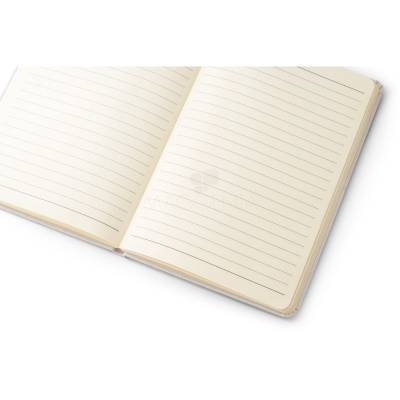 Caderno A5 em PET reciclado com tratamento antibacteriano, segundo a certificação ISO 20743. Contém 80 folhas pautadas cor marfim, em papel proveniente de gestão florestal sustentável, elástico e fita separadora.