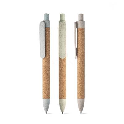Esferográfica em cortiça com clipe e elementos coloridos em fibra de trigo e PP.