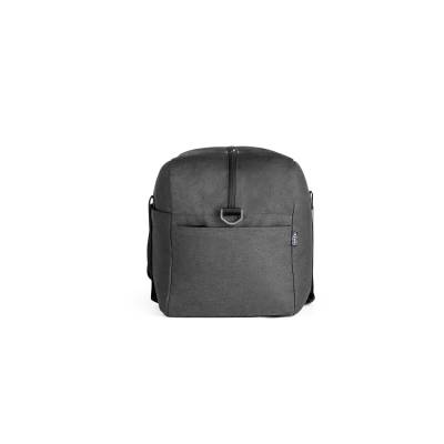 Bolsa esportiva em rPET 600D com interior forrado e fundo com placa semi-rígida. Compartimento principal e bolso frontal com fecho e dois bolsos laterais, um em rede e outro com fecho. A bolsa tem alça de ombro removível e ajustável em webbing com reforço almofadado.