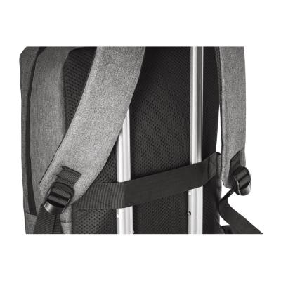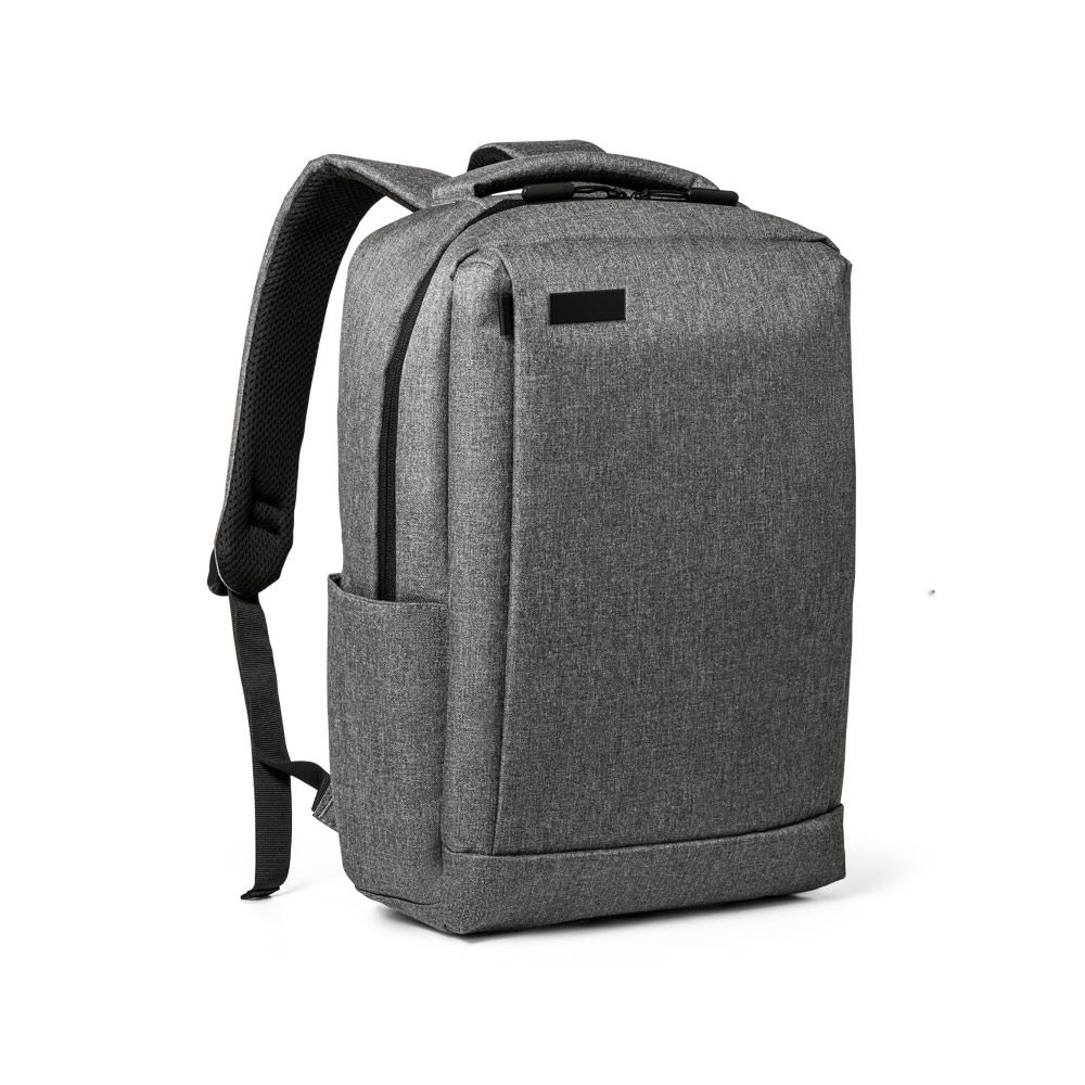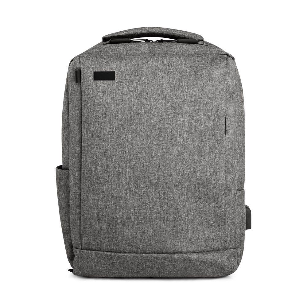 Mochila para notebook em 300D com placa de personalização. Tem 1 compartimento principal com 2 bolsos forrados para notebook até 15,6" e tablet 10,5" e diversos bolsos interiores. Contém ainda bolso frontal, lateral e entradas USB e Jack 3,5 mm.