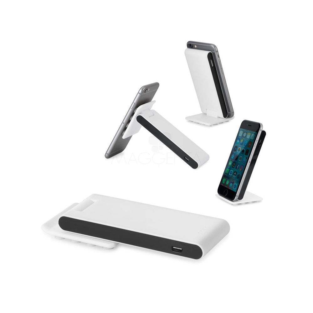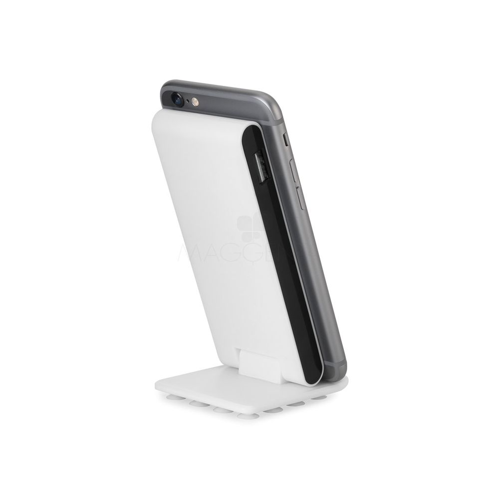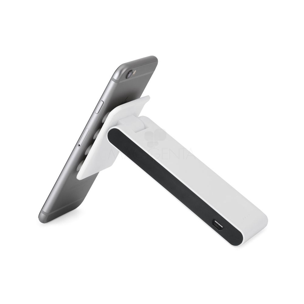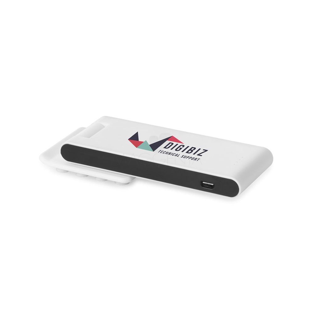 Bateria portátil em ABS com ventosas na base. Bateria de lítio com capacidade de 4.000 mAh, tempo de vida 500 ciclos e com entrada/saída 5V/1A. Incluso cabo USB / micro USB para carregar a bateria.