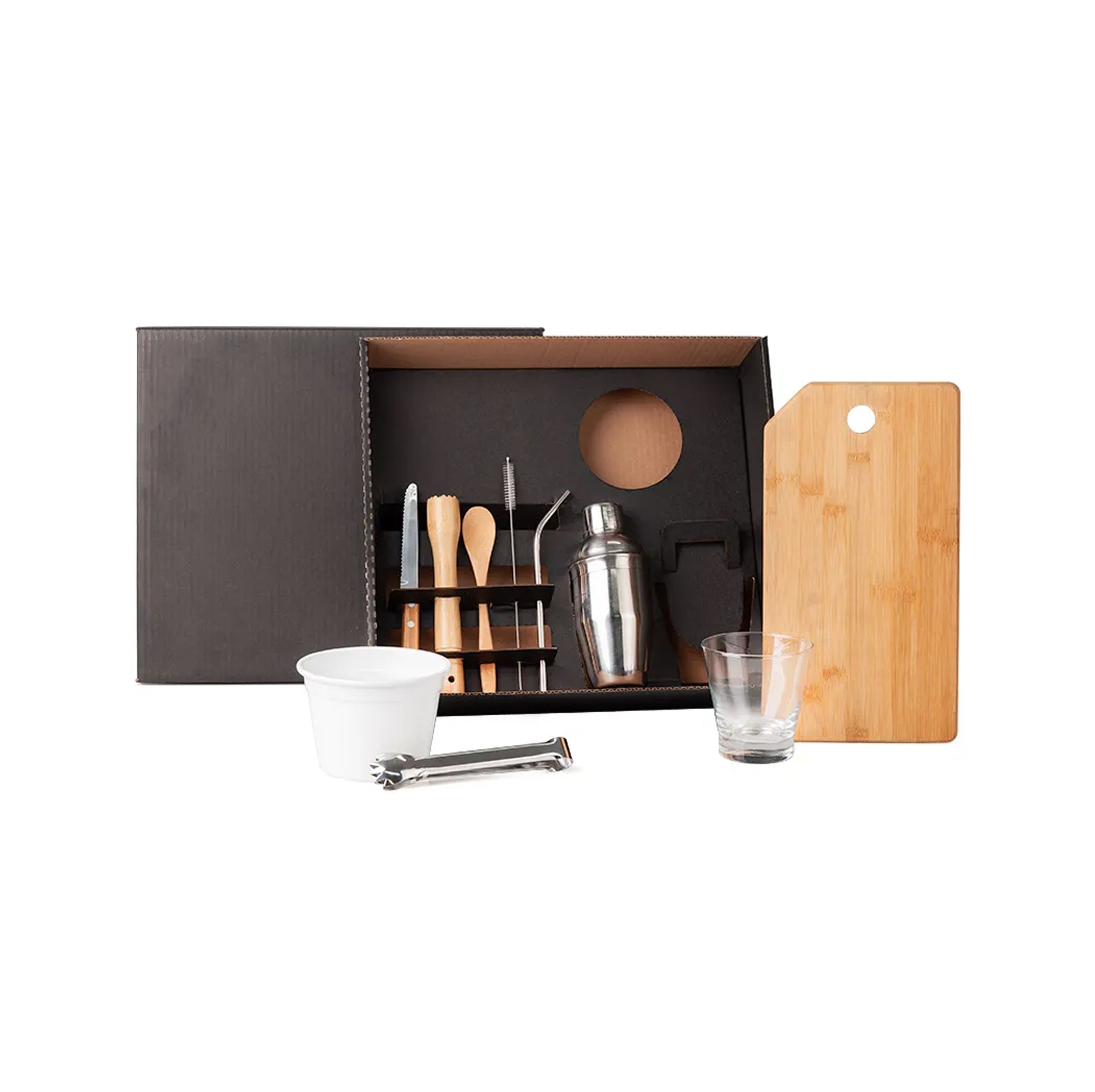 Kit para Caipirinha 10 peças. Conta com uma tábua em 1 furo, colher de 18cm e socador em Bambu, faca 4" em Bambu/Inox; coqueteleira, canudo, escova para canudo e pegador para gelo em Aço Inox, copo em Vidro e balde para gelo 750 ml em alumínio branco.