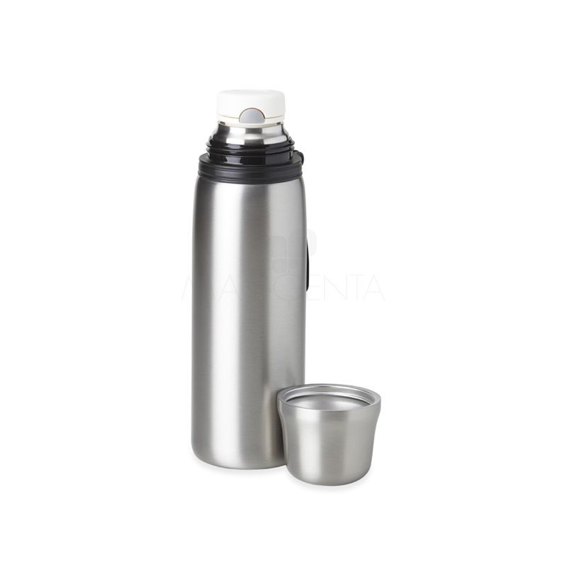 Garrafa térmica feita em inox com parede dupla, capacidade de 850ml. Com alça emborrachada para transporte, a garrafa contém filtro infusor, tampa com botão de acionamento e tampa externa utilizável como copo.