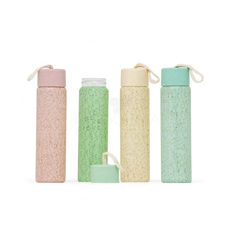 Garrafa personalizada com capacidade para 330ml produzida em vidro borossilicato. Possui acabamento adesivado, tampa plástica rosqueável com vedação para evitar o vazamento do líquido e alça de algodão. Ideal para divulgar sua empresa em eventos corporativos, brindes personalizados e campanhas promocionais.