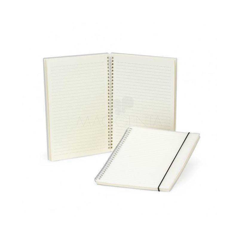 Bloco de anotação B5 com capa plástica e elástico para fechar que impede que abra acidentalmente. Contém aproximadamente 80 folhas marfim com pauta. Também conta com uma encadernação wire-ô, que garante que suas páginas não se soltem ou sejam perdidas. Ideal para divulgar sua empresa em eventos corporativos, brindes personalizados e campanhas promocionais.