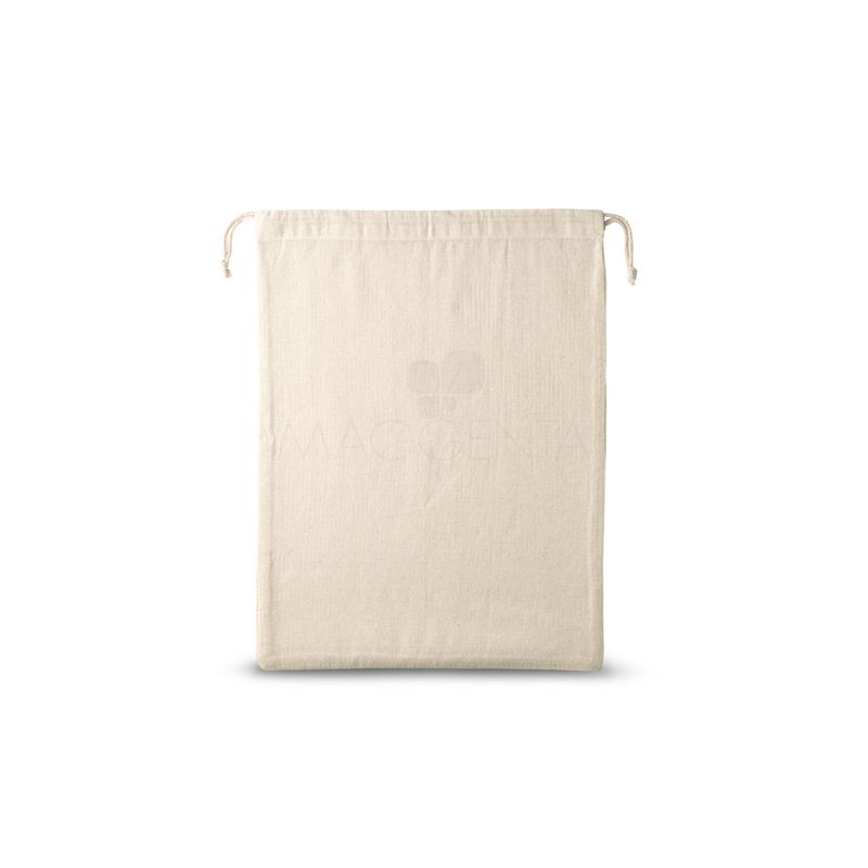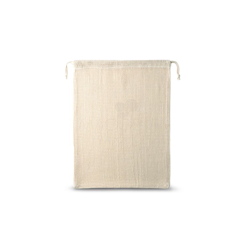 Sacola de algodão com malha personalizada. Seu material é 100% algodão na parte frontal e cordões em algodão para fechar. Sacola ideal para levar alimentos.