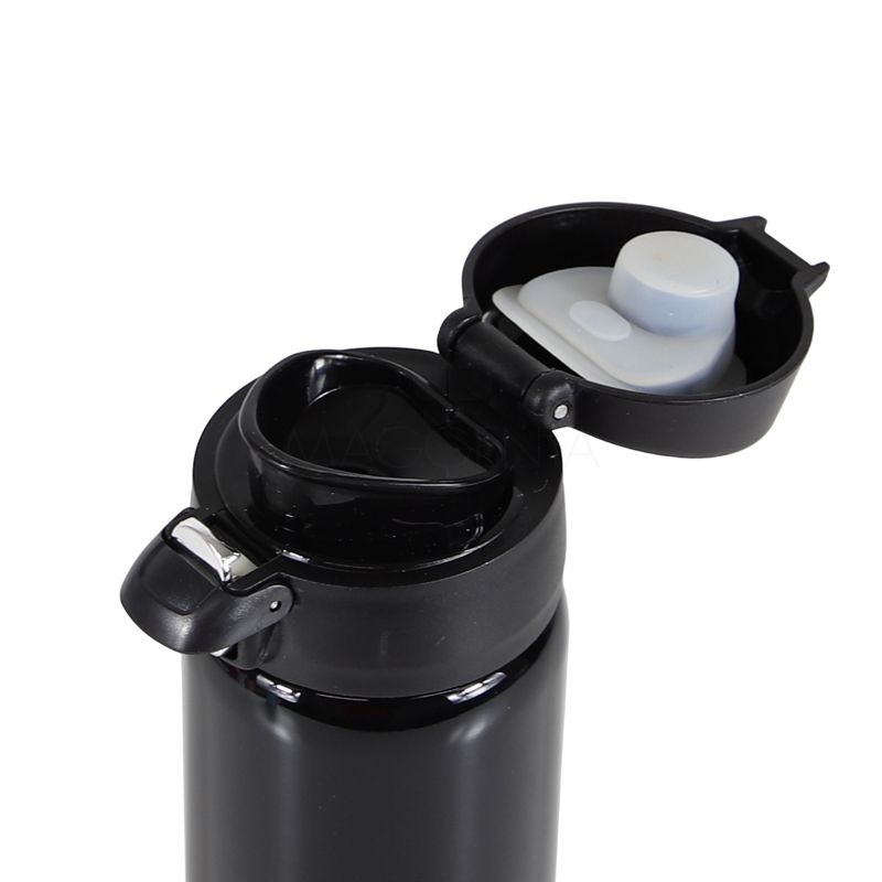 Squeeze garrafa personalizada produzido em metal inox, com capacidade de até 400 ml e tampa plástica atóxica rosqueável e anel de vedação em silicone para evitar vazamento, sistema de abertura automática com acionamento por botão frontal e trava de segurança para evitar que abra acidentalmente.
