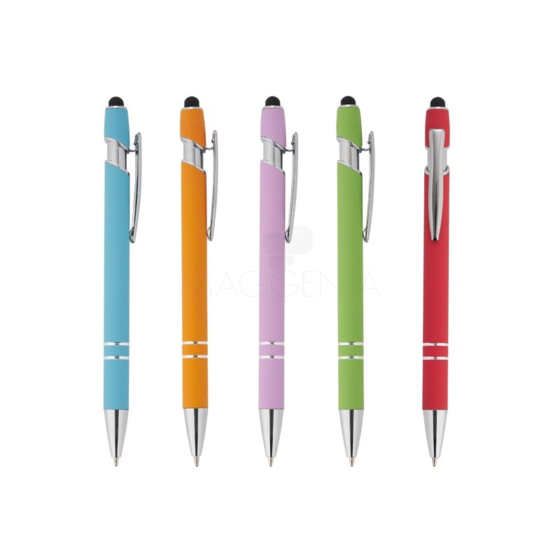 Caneta de metal personalizada com textura soft touch no corpo e dois aneis cromados adicionando mais beleza e elegância ao produto. Possui acionamento por click com escrita na cor azul, ponteira touch para uso em tablets e smartphone.