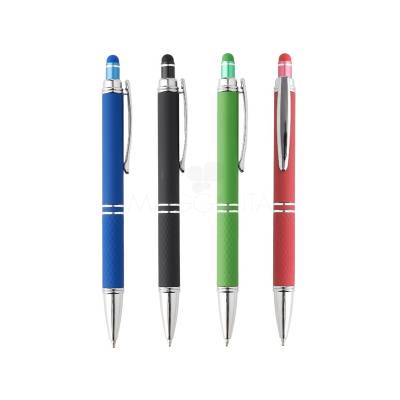 Caneta de metal personalizada. Clip de metal e a extremidade acobreados dando mais elegância, ponteira touch para uso em tablets, smartphones e telas touch screen, possui acionamento por click com escrita esferográfica na cor azul e acabamento soft touch de diversas cores. Ideal para brindes promocionais e eventos corporativos.