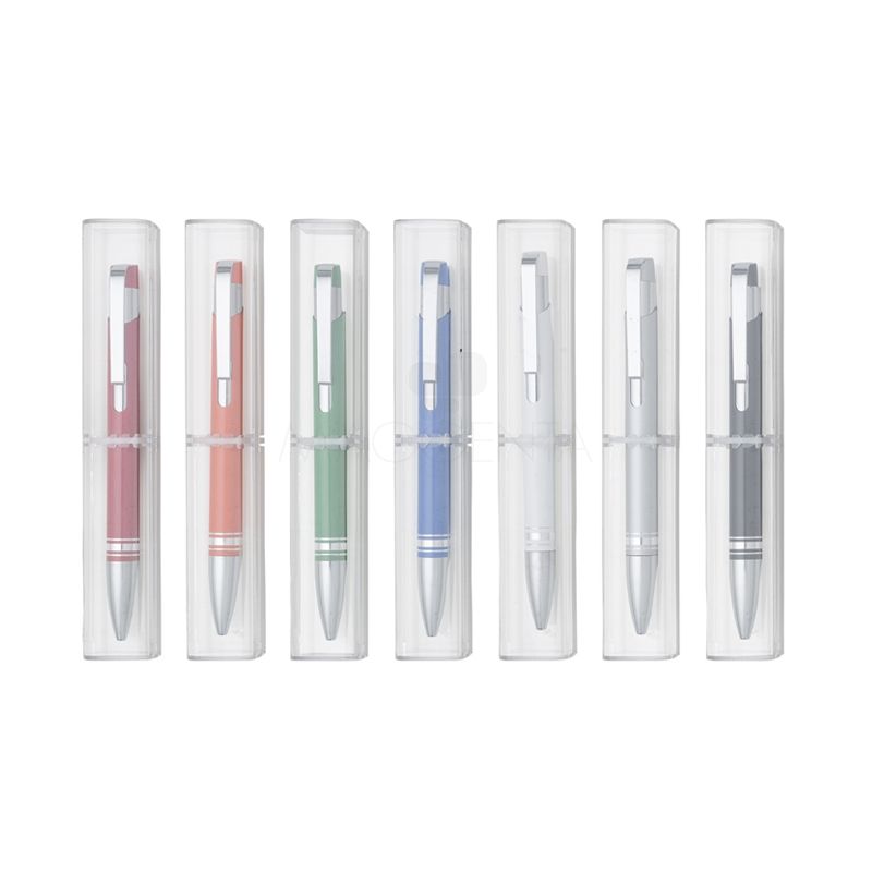 Conjunto caneta com estojo de acrílico. Caneta semi metálica com carga esferográfica azul e acionamento por clique. Ideal pra brindes personalizados e eventos corporativos.