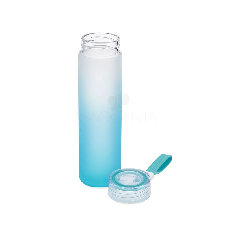 Squeeze garrafa personalizado com capacidade para 450ml produzida em vidro borossilicato. Possui tampa rosqueável em PP com vedação para evitar o vazamento do líquido, alça de silicone flexível e acabamento em degradê diferenciado. Ideal para divulgar sua empresa em eventos corporativos, brindes personalizados e campanhas promocionais.