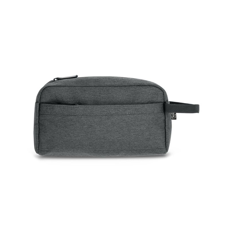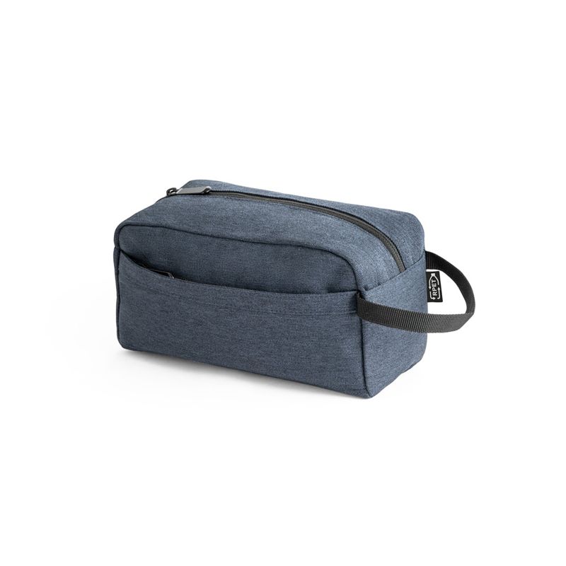 Nécessaire personalizada produzida em rPET 600D com interior forrado. Possui bolso frontal com zíper e alça lateral em webbing. Ideal para brindes promocionais e eventos corporativos.