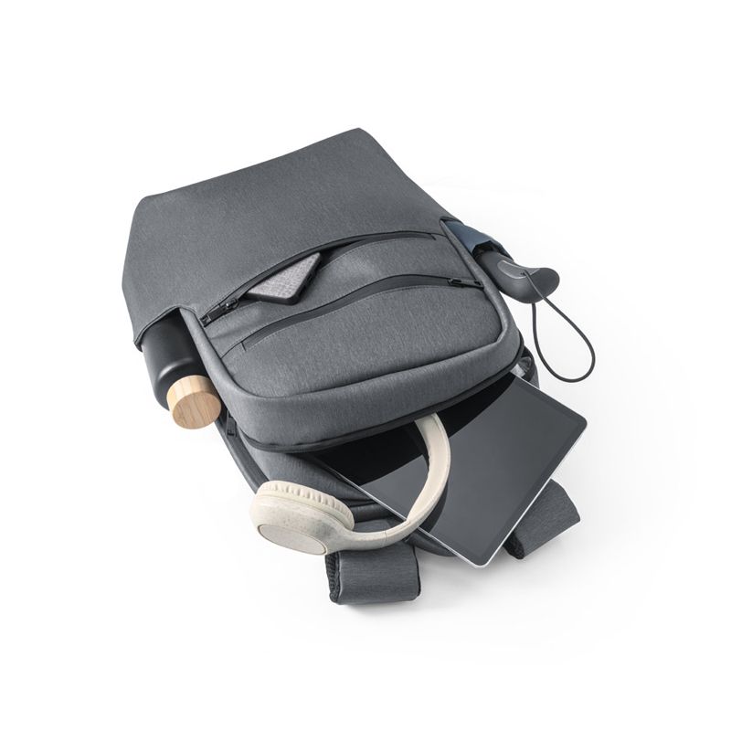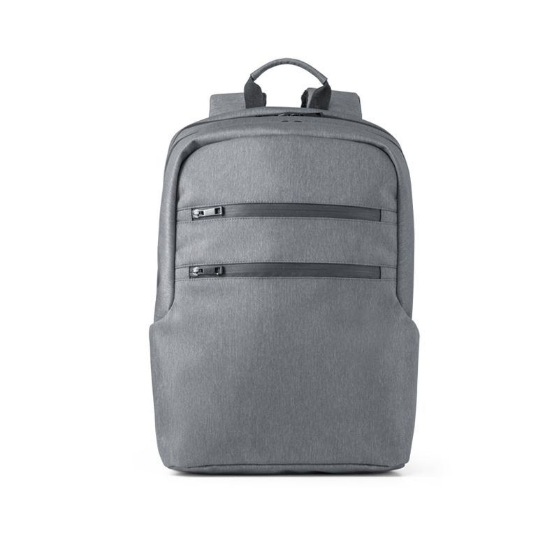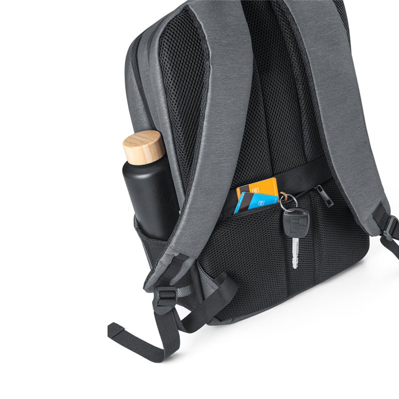 Mochila para notebook personalizada produzida em Nylon 2Tone impermeável com 2 compartimentos e alças almofadadas. O compartimento posterior tem 2 divisórias almofadadas com fecho em velcro para notebook até 17'' e tablet até 10.5''. Compartimento frontal com diversos bolsos interiores. Contém dois bolsos na parte frontal, tendo um deles bloqueio RFID. Nas laterais existe um bolso para garrafas em elastano e outro para o guarda chuva, com ilhós perfurados para evitar acumulação de água. A parte posterior almofadada tem um bolso oculto e uma banda para transporte em trolley. Imagem ilustrativa, objetos decorativos não acompanham o produto.