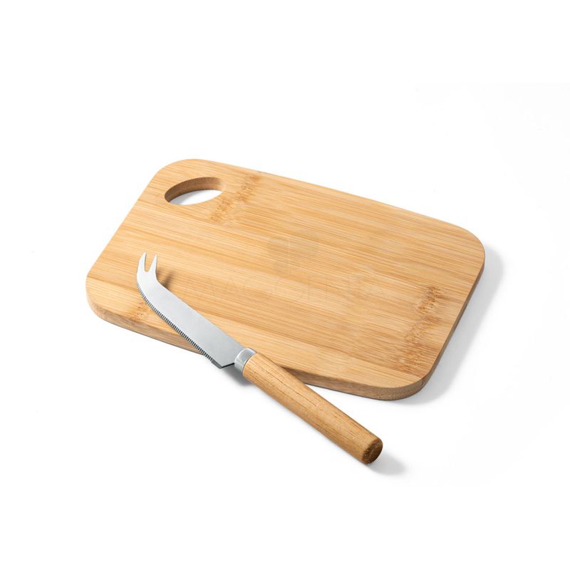 Kit queijo 2 peças personalizado, possui uma tábua de corte e uma pequena faca de queijo em bambu. Kit fornecido em caixa presente de papel craft personalizável. Ideal para divulgar sua empresa em eventos corporativos, brindes personalizados e campanhas promocionais.