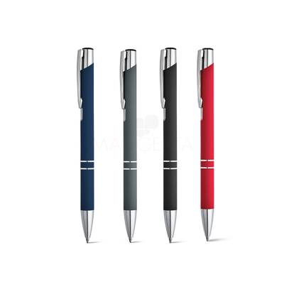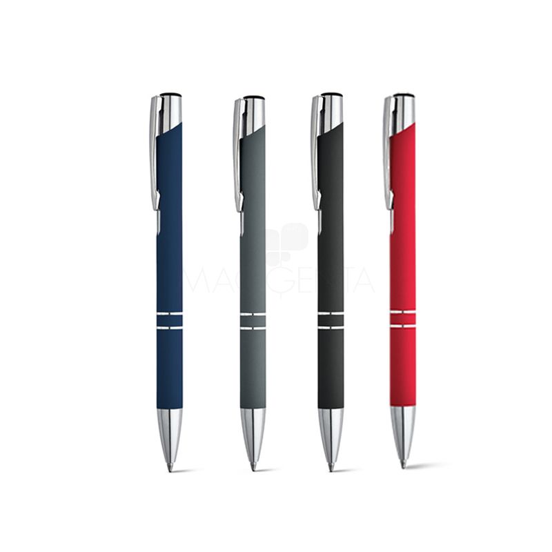Caneta de Metal personalizada com corpo de textura emborrachada, clip de metal esferográfica na cor azul e acionamento por clik. Ideal para brindes promocionais e eventos corporativos.
