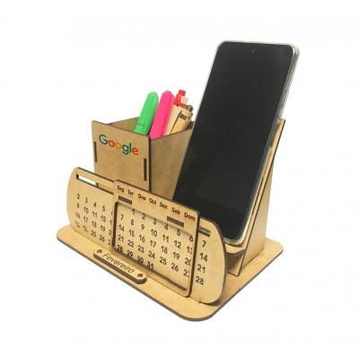 Calendário ecológico personalizado em MDF 3mm, possui porta canetas e um porta celular. Personalização colorida. Ideal para divulgar sua empresa em eventos corporativos, brindes personalizados e campanhas promocionais.