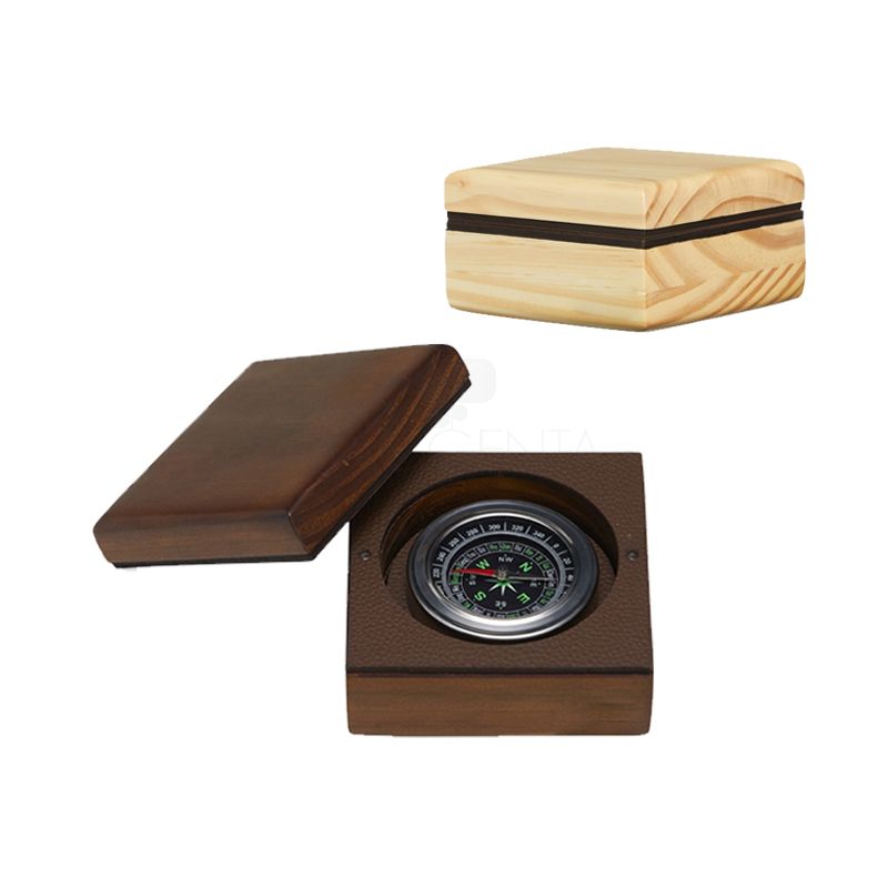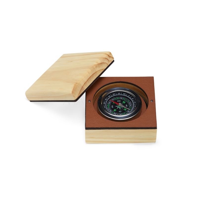 Bússola personalizada, acompanhada por um estojo imantado feito com madeira de reflorestamento, recouro e acabamento em veludo. Esse estojo não apenas proporciona um armazenamento seguro para a bússola, como também adiciona um toque de sofisticação ao conjunto, sendo perfeito para presentear ou exibir em uma coleção de objetos preciosos.