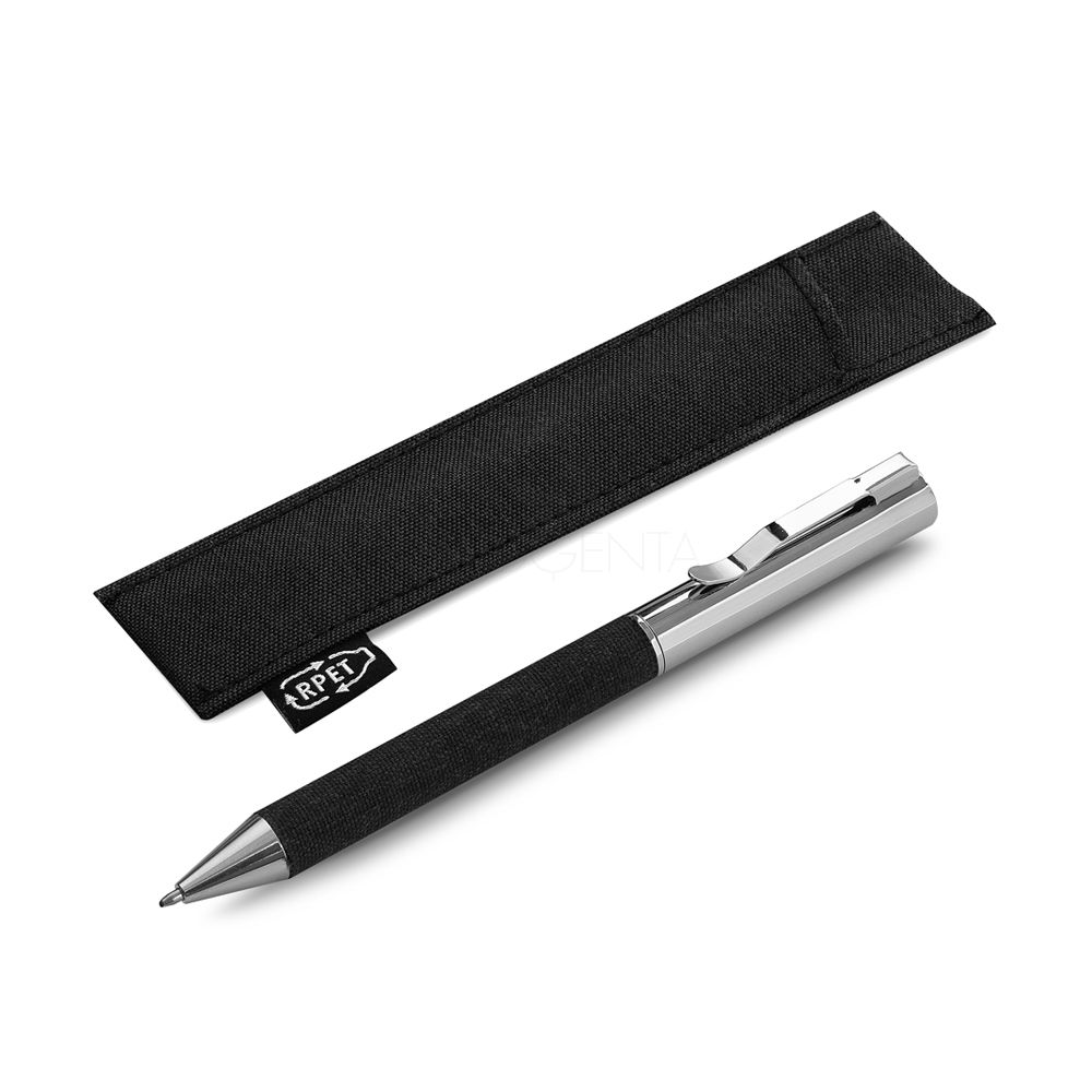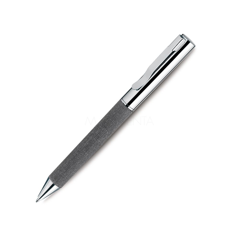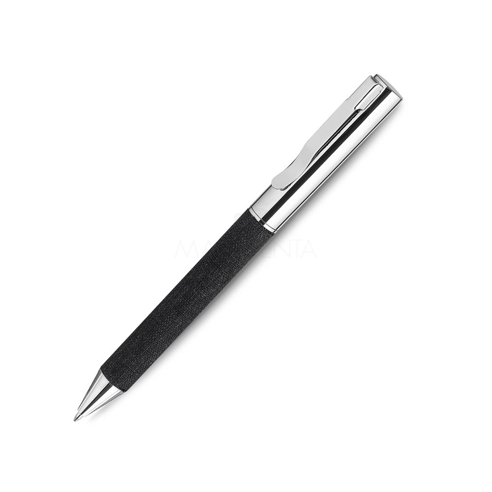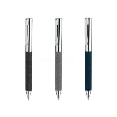 Caneta de metal personalizada com detalhe em tecido, possui acabamento em metal, acionamento da escrita giratório, esferográfica preta e embalagem em material reciclável seguindo a cor do detalhe. Ideal para divulgar sua empresa em eventos corporativos, brindes personalizados e campanhas promocionais.