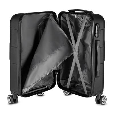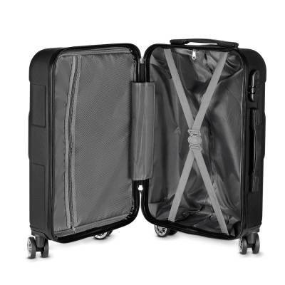 Mala de bordo em plástico ABS; Abertura frontal com ziper para acesso ao interior da mala; Forro poliéster; Sistema de carrinho de aço; Alça de mão na lateral e na parte superior; Quatro rodas de 360 graus; Acompanha Plaquinha de metal sem personalização. Mala perfurada para aplicação da plaquinha.