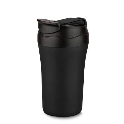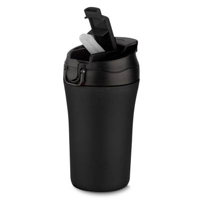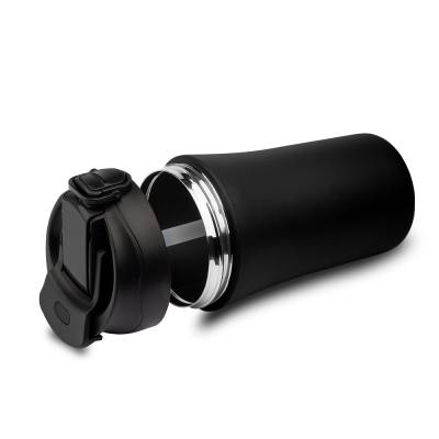 Copo térmico com parede dupla, saída de líquido tanto por sucção (canudo) como por bico, com base revestida de borracha antiderrapante.