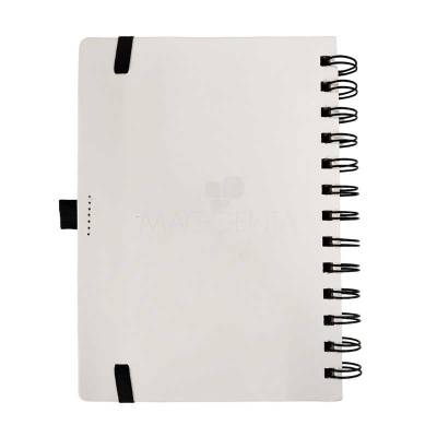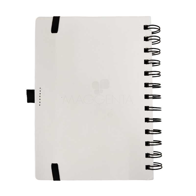 Caderno de anotações em ABS reciclável com aspiral e suporte para caneta. Em capa dura frontal em textura que imita ''pedra'' e capa traseira na cor branca, suas folhas são impermeáveis e resistentes a rasgos, miolo com 70 folhas pautadas na cor branca. Acompanha caneta.