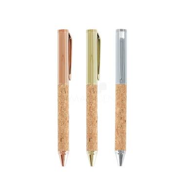 Caneta metálica com detalhe em cortiça, carga esferográfica azul 1.0mm e acionamento por rotação.