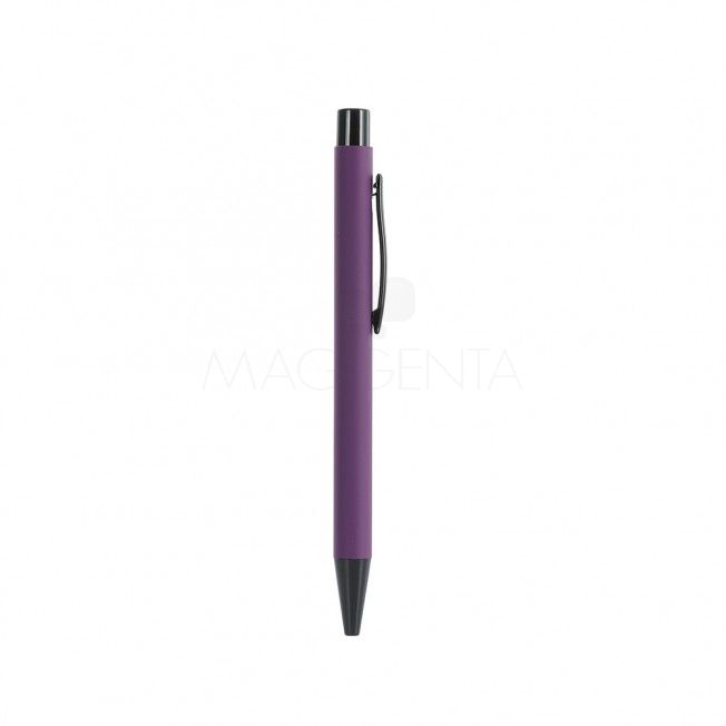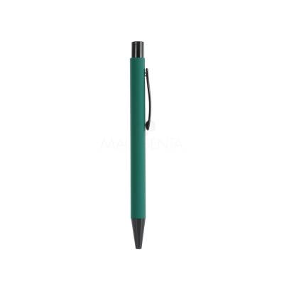 Caneta metálica com acabamento emborrachado, carga esferográfica azul 1.0mm e acionamento por clique.