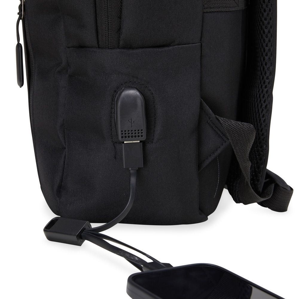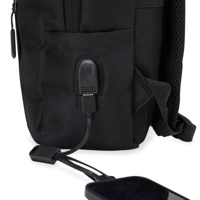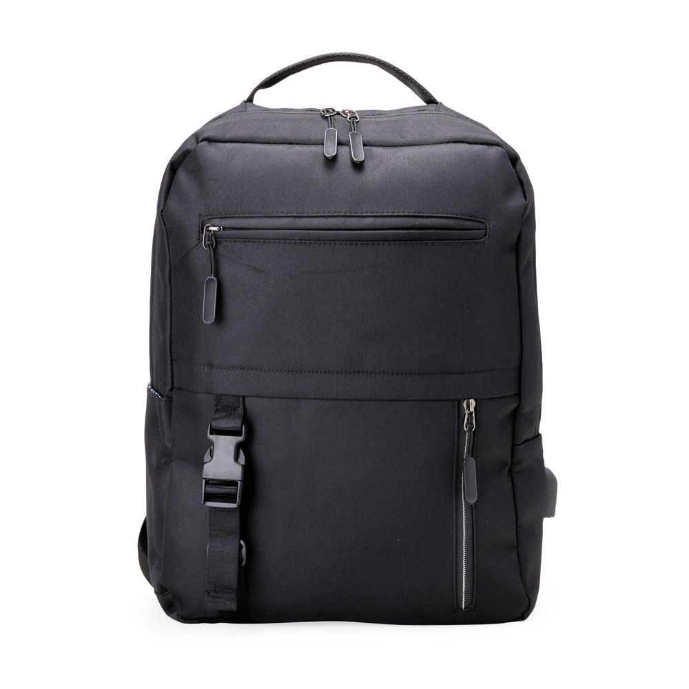 Mochila de nylon 23 Litros com 3 compartimentos, sendo o principal com bolso para notebook 15,6. Com divisórias internas para acessórios, a mochila possui bolso lateral, suporte externo USB e alça para encaixe em malas e viagens.