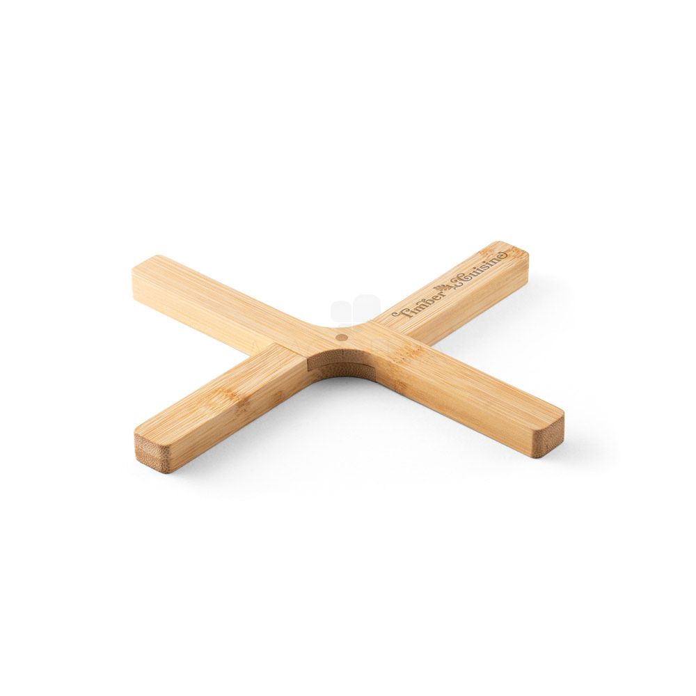 Descanso de panela dobrável em bambu. Fornecido em caixa oferta em papel kraft.