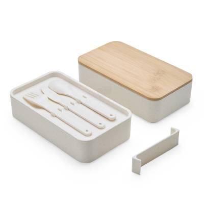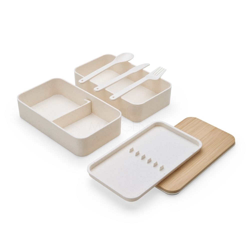 Marmita dupla em fibra de trigo livre de BPA, sendo um compartimento de 600ml com tampa de bambu e outro compartimento de 500ml com suporte para talheres de fibra de trigo. Possui uma divisória removível e elástico para um transporte seguro. Acompanha garfo, faca e colher. Obs: O tempo de aquecimento no micro-ondas não deve ultrapassar 3 minutos.