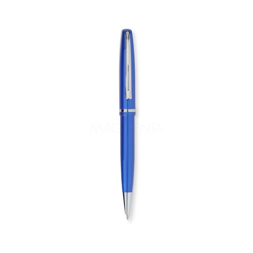 Conjunto de caneta e lapiseira metálicas em estojo metal. Caneta e lapiseira possuem acabamento brilhante, carga esferográfica azul de 1.0mm e acionamento por rotação.