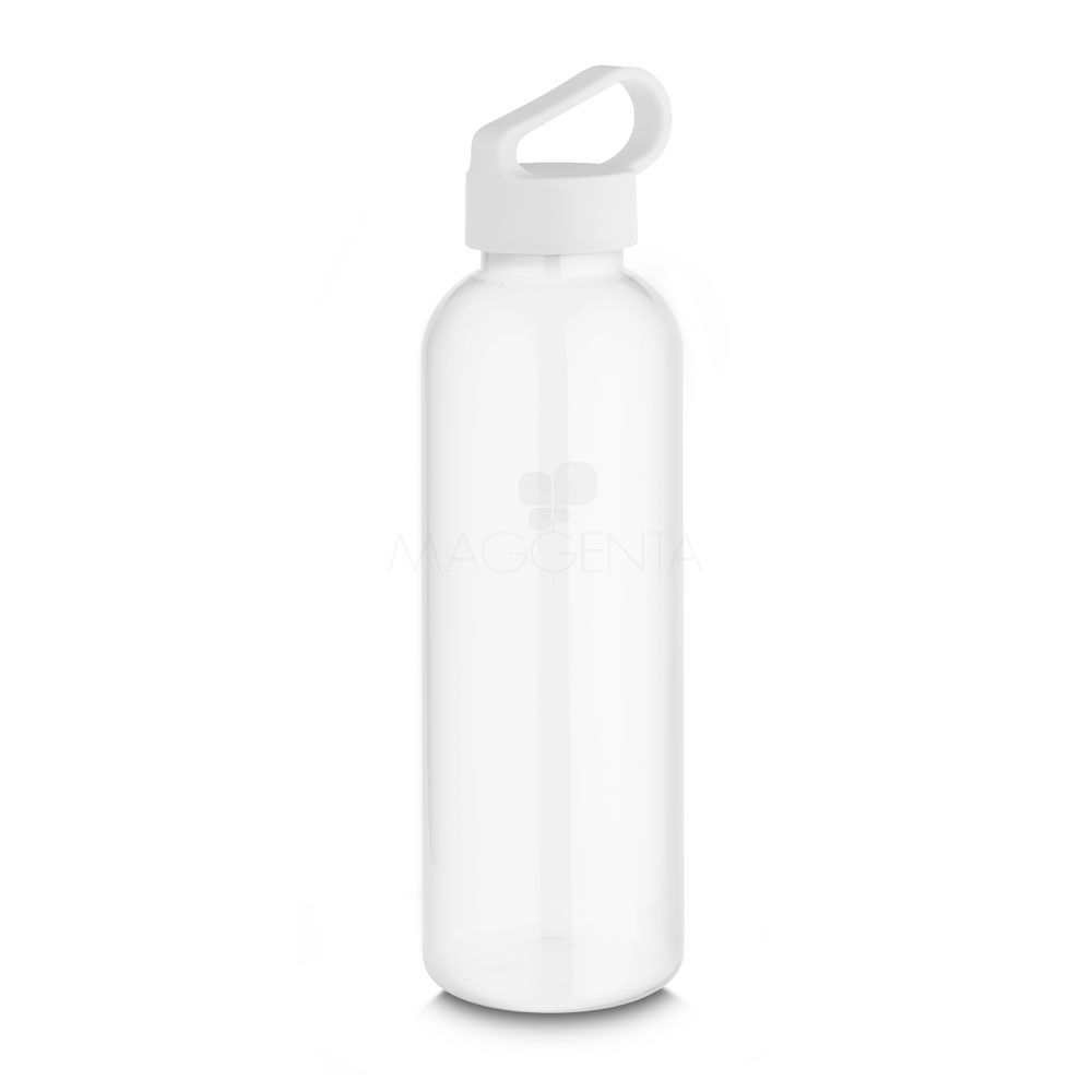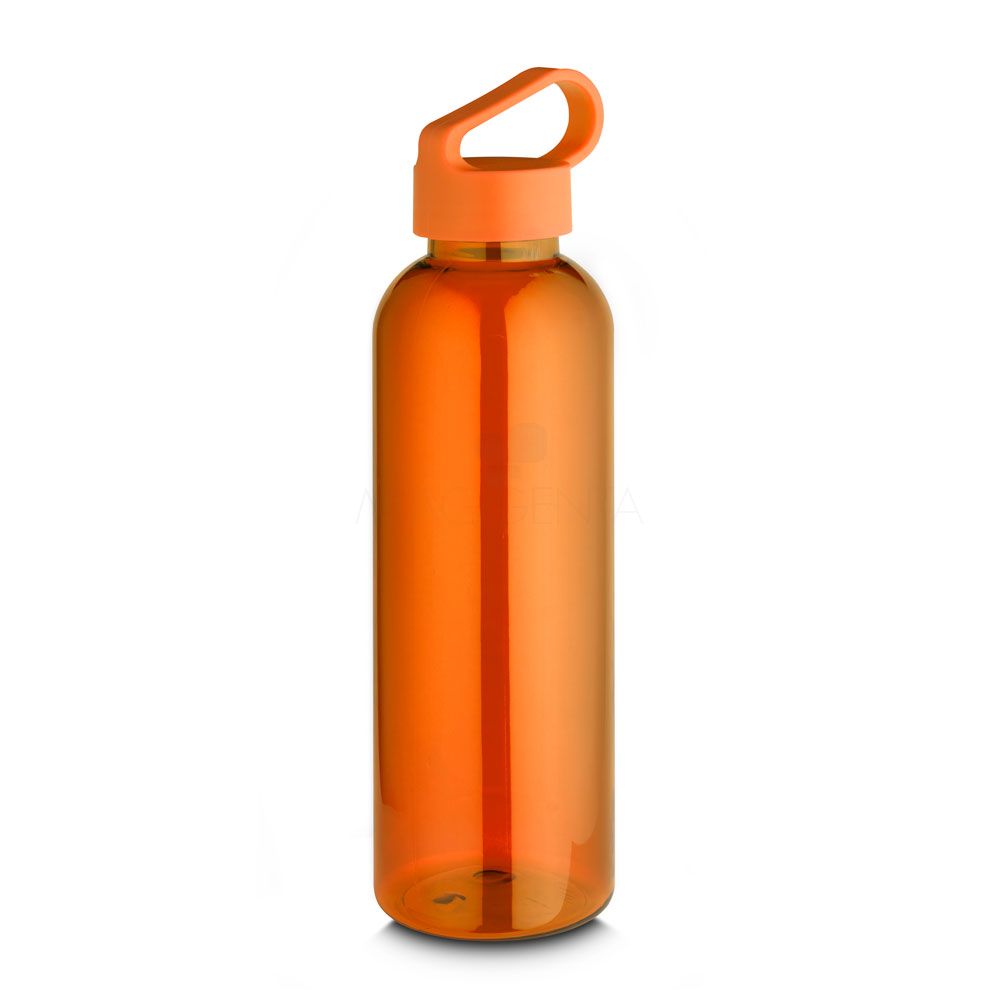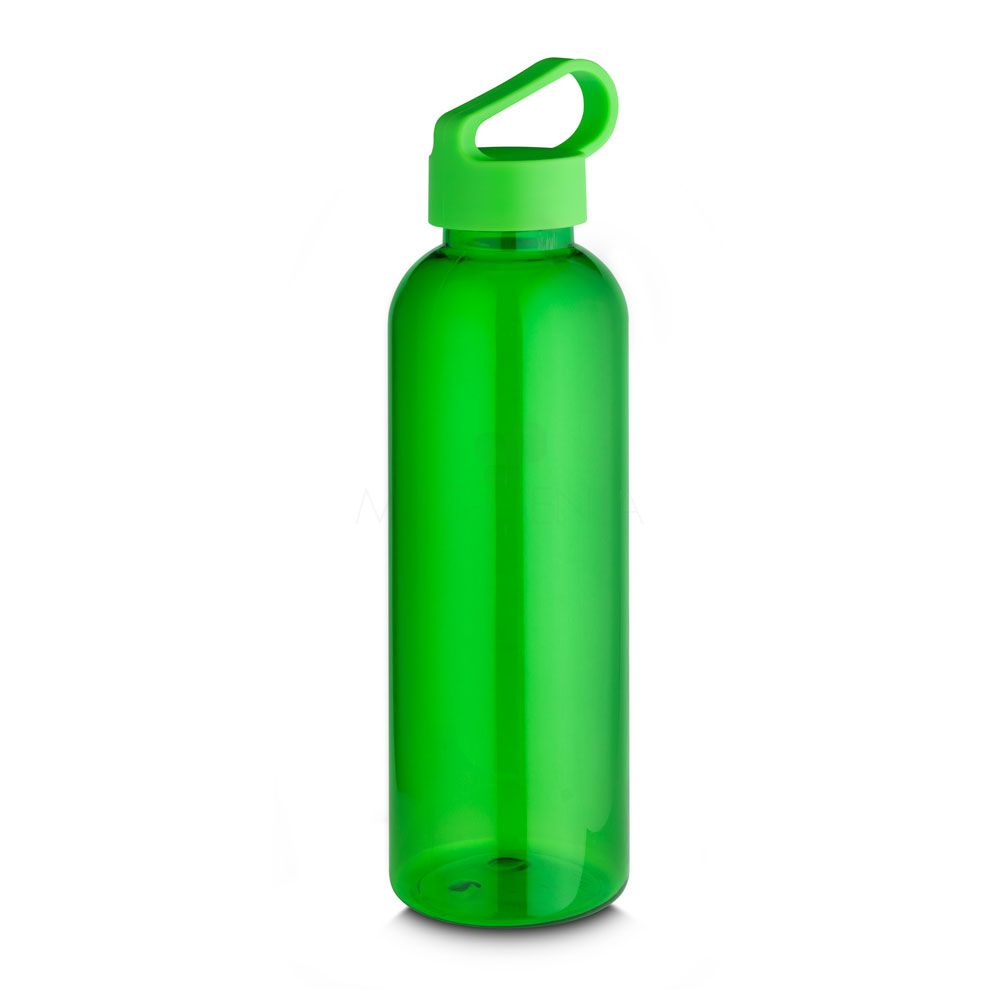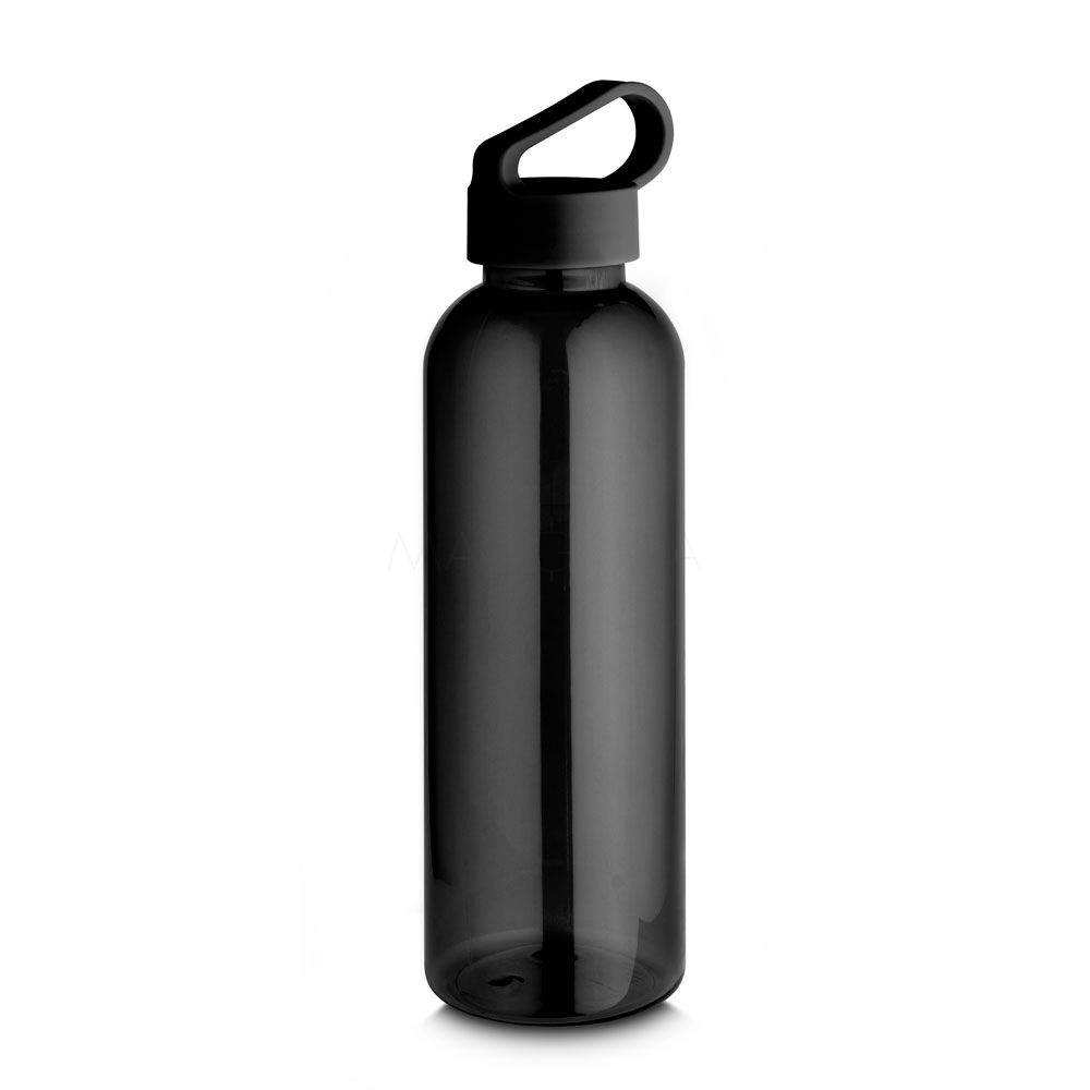 Garrafa *RPET com capacidade de até 550ml, tampa plástica com alça integrada. *RPET: Tereftalato de polietileno reciclado